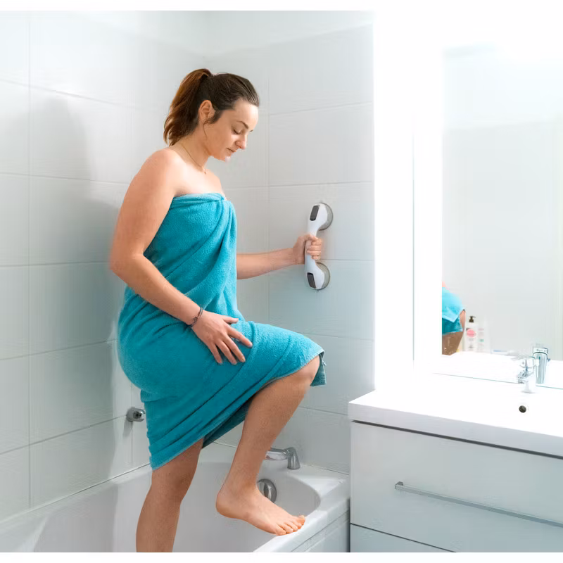 Håndtaket festes enkelt med to sterke sugekopper som skaper et vakuum mot underlaget, og den innebygde låsefunksjonen sørger for at håndtaket sitter godt fast. Støttegrepet fester seg utmerket på de fleste glatte og plane overflater som fliser, porselen og glatte vegger (ikke våtromstapet) og er enkelt å flytte rundt og praktisk å ta med på reiser og overnattinger ved behov.