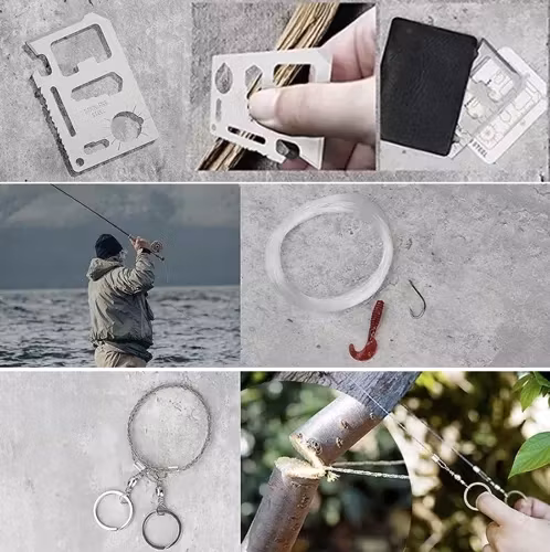 Settet inneholder blant annet kniv, kompass, wiresag, fiskesene, tennstål, nødteppe, lommelykt og multiverktøy, i tillegg til flere andre nyttige hjelpemidler. Du får i praksis alt du kan trenge når du er på camping eller fottur – eller dersom en krisesituasjon skulle oppstå.