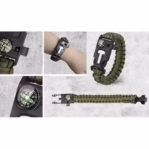 - Overlevelsesarmbånd i paracord – ca. 350 cm paracord med kompass, fløyte og tennstål