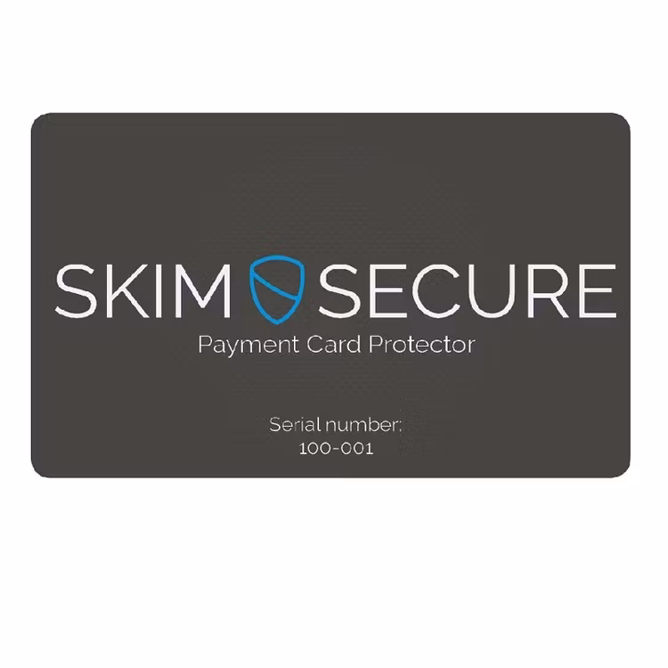 SkimSecure beskyttelseskort er en effektiv beskyttelse mot de økende kortsvindlene. Kortet, som kun er 0,9 mm tykt, ser ut som et vanlig bankkort, men inneholder en teknologi som effektivt stopper tyver fra å stjele kortopplysningene dine. SkimSecure RFID-beskyttelse er alltid aktiv, og så snart en tyv eller annen uautorisert person prøver å lese kortinformasjonen din, skaper SkimSecure beskyttelseskort et elektromagnetisk felt som gjør kortopplysningene dine uleselige. Et SkimSecure-kort beskytter effektivt lommeboken din.
